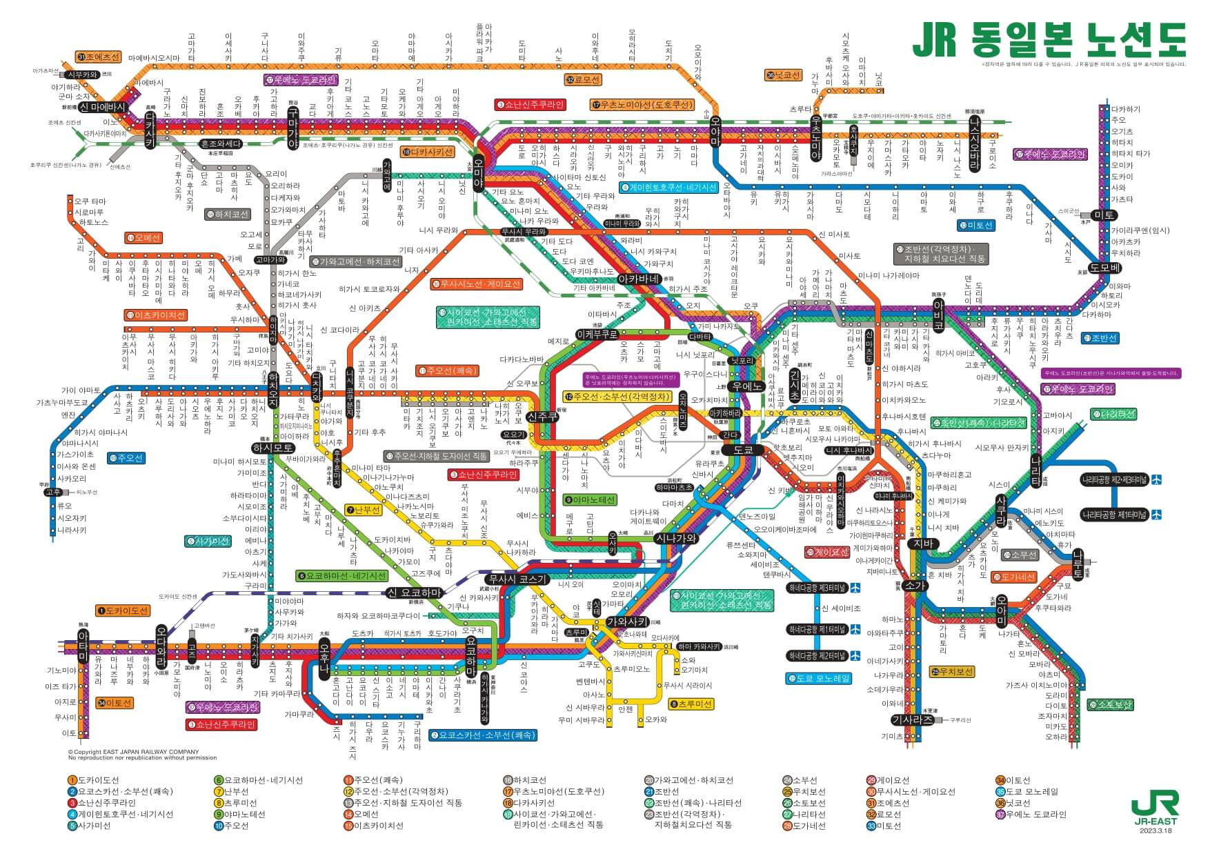 이 노선도는 JR을 중심으로 만들어진 일본 지하철 노선도입니다. 해당 파일을 직접 다운로드해도 되지만, '한글 버전 도쿄 지하철 노선도 pdf파일'을 JR 동일본 여객철도 주식회사 홈페이지에서 제공하므로 더 나은 화질로 저장할 수 있습니다.