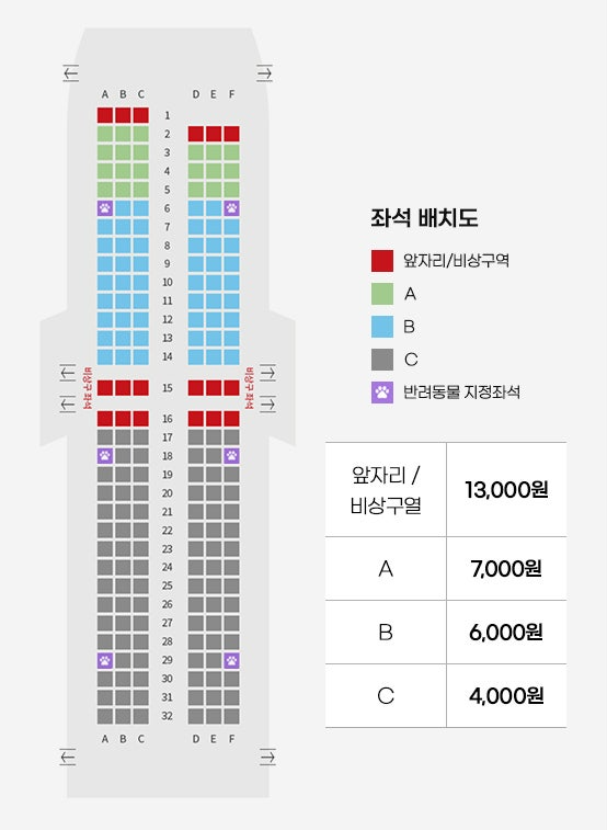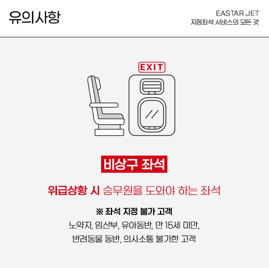 - 비상구 좌석 조건: 비상구 좌석은 만 15세 이상이며 신체 건강한 승객만 선택이 가능합니다.
