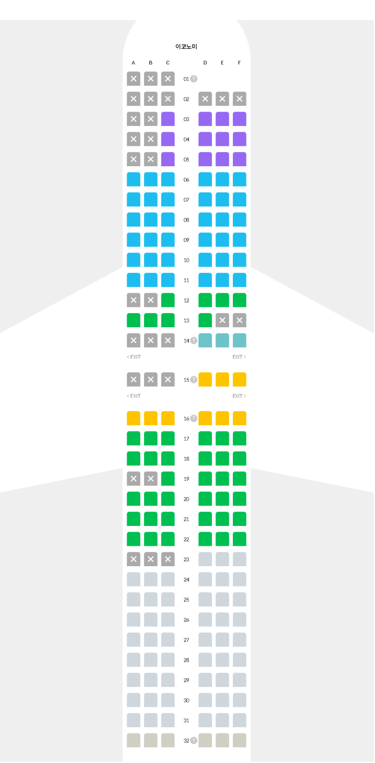 좌석은 총 3-3 배열로 구성되어 있습니다. 즉, 한 줄에 6개의 좌석이 배치되어 있어 양쪽 창가와 중앙 통로를 기준으로 나뉩니다. 이코노미석이지만, 앞좌석 공간이 넉넉한 특정 좌석(예: 비상구 좌석)은 추가 요금을 지불하면 선택할 수 있습니다.