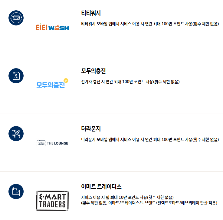 - 외식: 유명 레스토랑, 카페 등에서 포인트를 사용하여 식사, 음료를 즐길 수 있습니다.